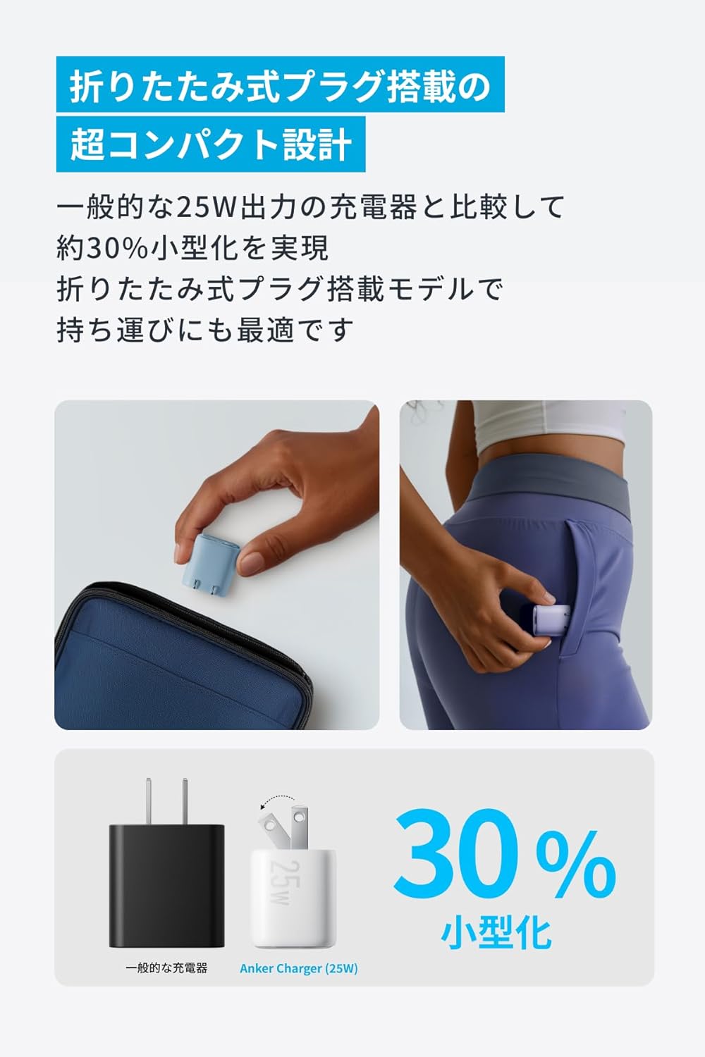 折りたたみ式プラグ搭載の超コンパクト設計:一般的な25W出力の充電器と比較して約30%小型化を実現。折りたたみ式プラグ搭載モデルで持ち運びにも最適です。