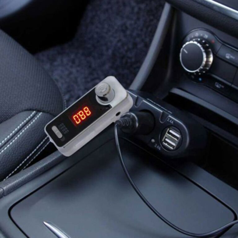 車内のカーステレオからスマホ内の音楽を流せるだけでなく、ケーブル接続でスマホやワイヤレスイヤホンなど様々な電子機器の充電やハンズフリー通話に活用が見込める3in1のFMトランスミッターですよ。