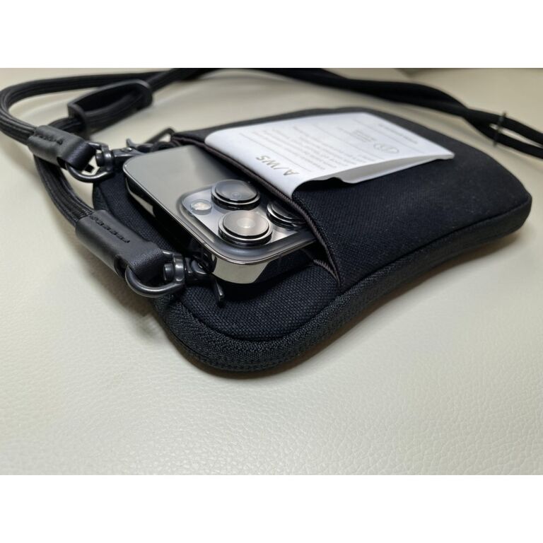 ちなみに、僕のiPhone 13 Proにちょっぴりゴツい耐衝撃ケース「Atomic SLIM 4」を付けた状態で入れてみたら入った。ただ、結構ギリギリだし他のカードや小銭などをポーチに入れるとパンパンになるので見た目的にはおすすめできないかな。