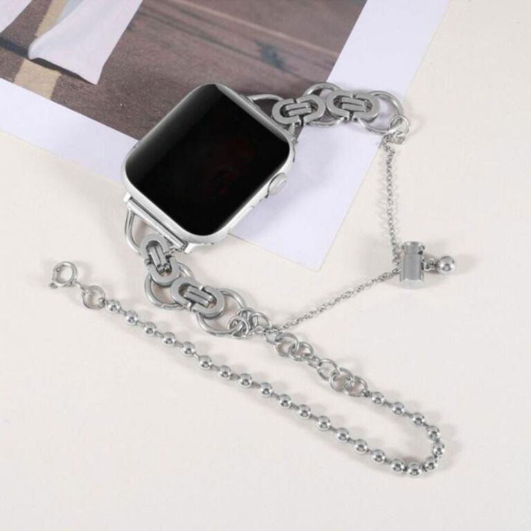 AppleWatchを腕に固定させるためのベルト部分はメタル調でかっこいいバンドです。それに加えて長さ調節が可能なビーズリングチェーンが装備されています。ビーズチェーンがあるからこそブレスレットのようなおしゃれ感を持たせてくれているんです。