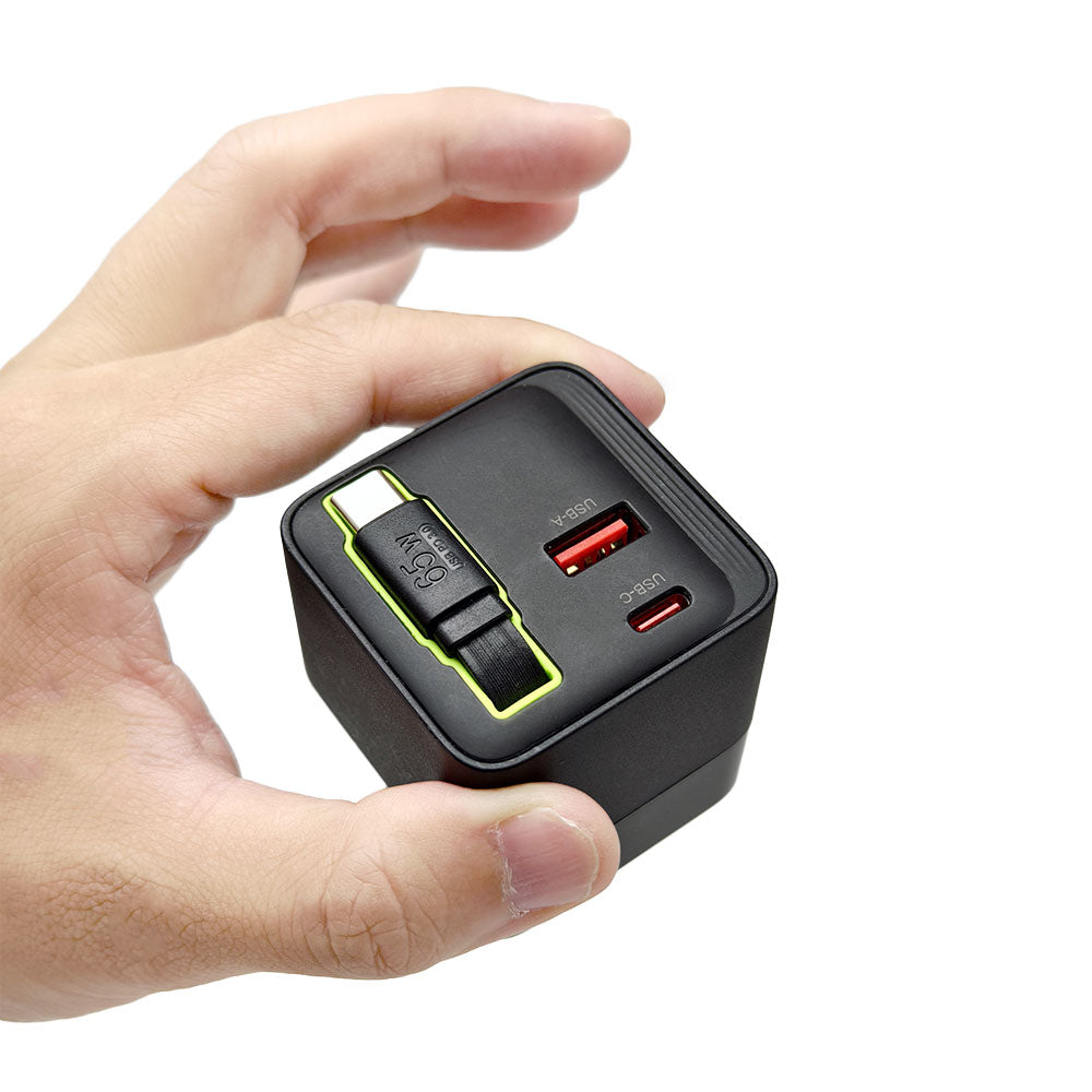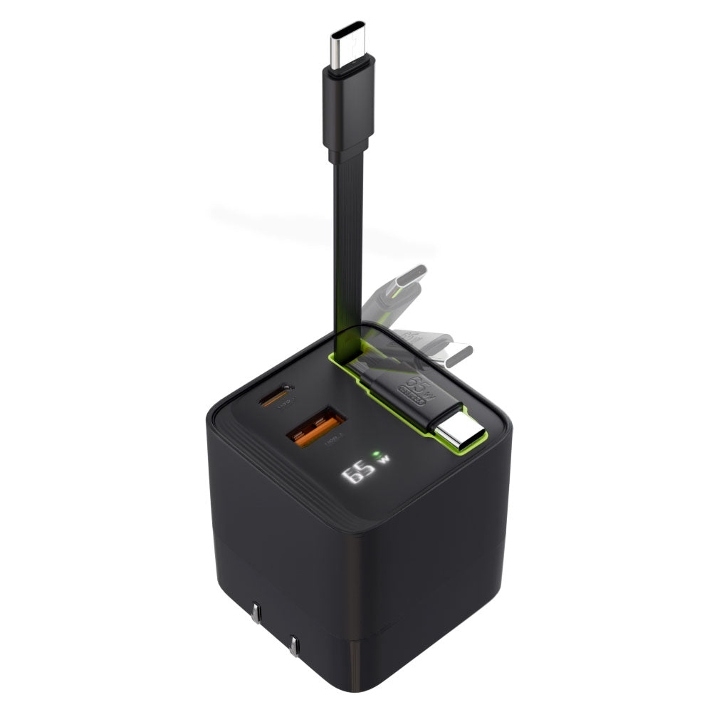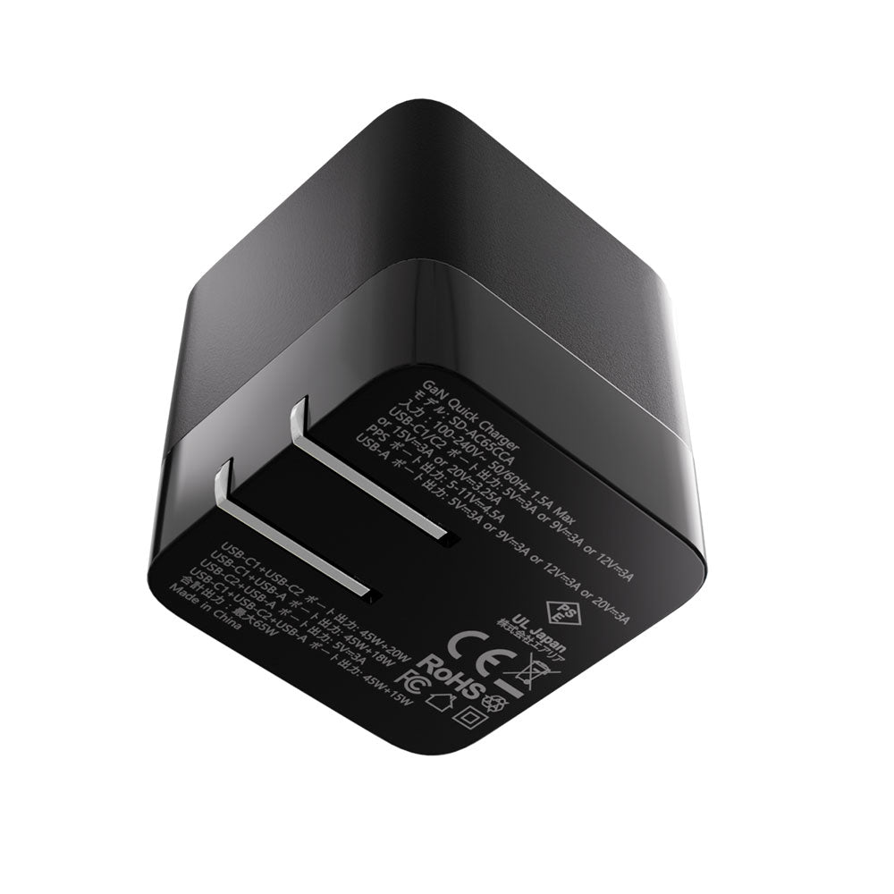 | 出力 | 1:TypeC(ケーブル内蔵)約80cm 5V3A/ 9V3A/ 12V3A/ 15V3A/ 20V3.25A(65W) PPS:5-11V4.5A 2:TypeCポート : 5V3A/ 9V3A/ 12V3A/ 15V3A/ 20V3.25A(65W) 3:USBポート: 5V3A/ 9V2A (18W) |