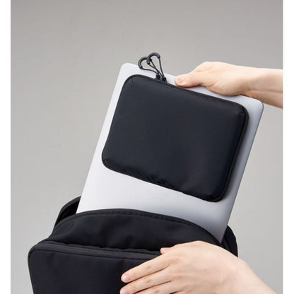 粘着シートでしっかり固定でき、ノートPCに貼り付けたままスムーズに周辺機器を持ち運ぶことができます。ポーチ型で口を閉じられるため、収納物が落下しにくく、持ち運びしやすいのが特長です。粘着シートは糊跡の残りが少ないタイプを採用しています。