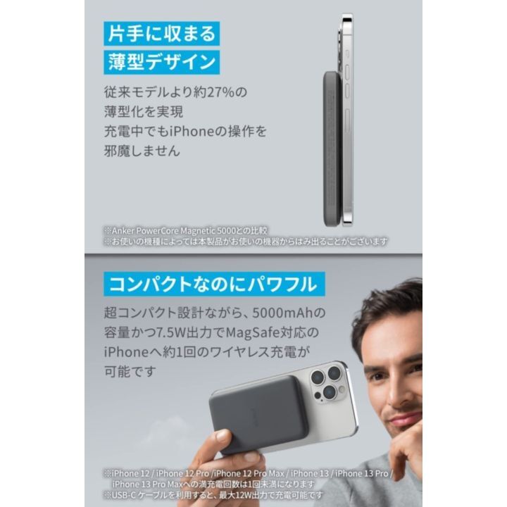 充電スタンドからマグネット式ワイヤレス充電対応モバイルバッテリーにも充電されるため、バッテリーへの充電忘れがありません。モバイルバッテリー部分は従来モデルより約27%の薄型化を実現し、充電中でもiPhoneの操作を邪魔しません。さらに超コンパクト設計ながら、5000mAhの容量かつ7.5W出力でMagSafe対応のiPhoneへ約1回充電が可能です。※USB-Cケーブルを利用すると、最大12W出力で充電可能でいつでもお好きな時に持ち運べます。※iPhone12 Pro Max / iPhone 13 / iPhone 13 Pro / iPhone13 Pro Maxへの満充電回数は1回未満になります (Anker調べ) 。