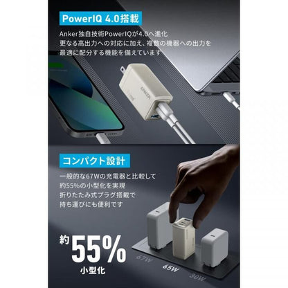 一般的な67W出力以上の充電器に比べ、約55%小さなコンパクトサイズを実現。折りたたみ式プラグを採用し、どこでも気軽に持ち運ぶことができます。