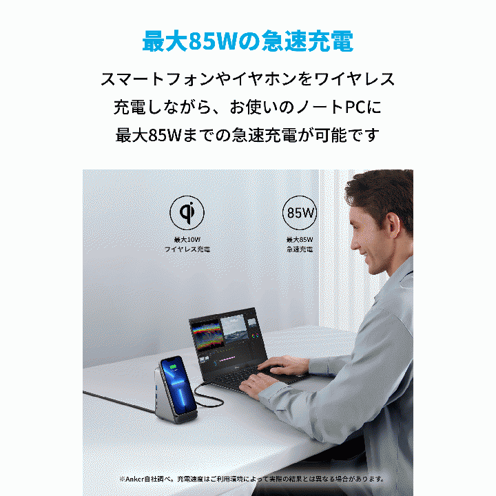 スマートフォンやイヤホンをワイヤレス充電しながらも、お使いのノートPCに最大85Wまでの急速充電が可能です。