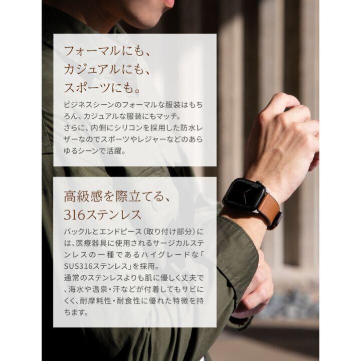 本革とシリコンのハイブリッド構造が特徴です。汗や水に強く、耐久性も高いので、アクティブな方にもおすすめです。デザインもシンプルで上品なので、どんなスタイルにも合わせやすいでしょう。