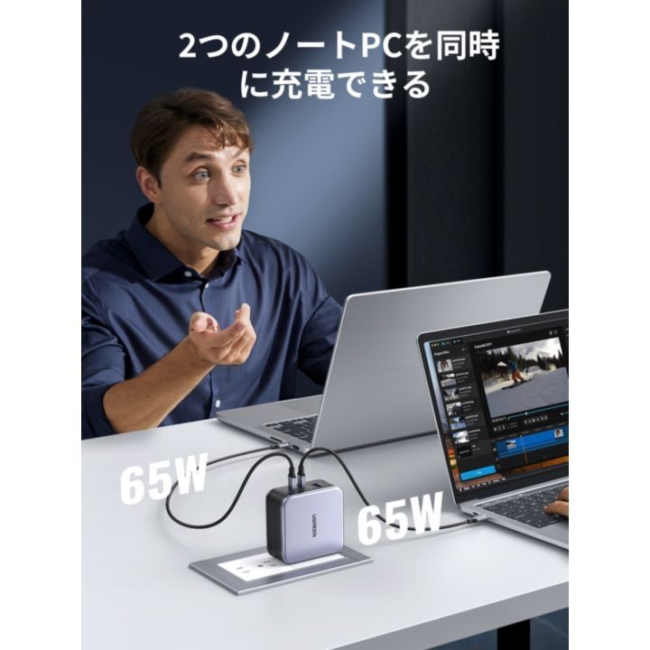 スマートな充電技術により、2台のノートブックの65W急速充電を同時に実現します。
