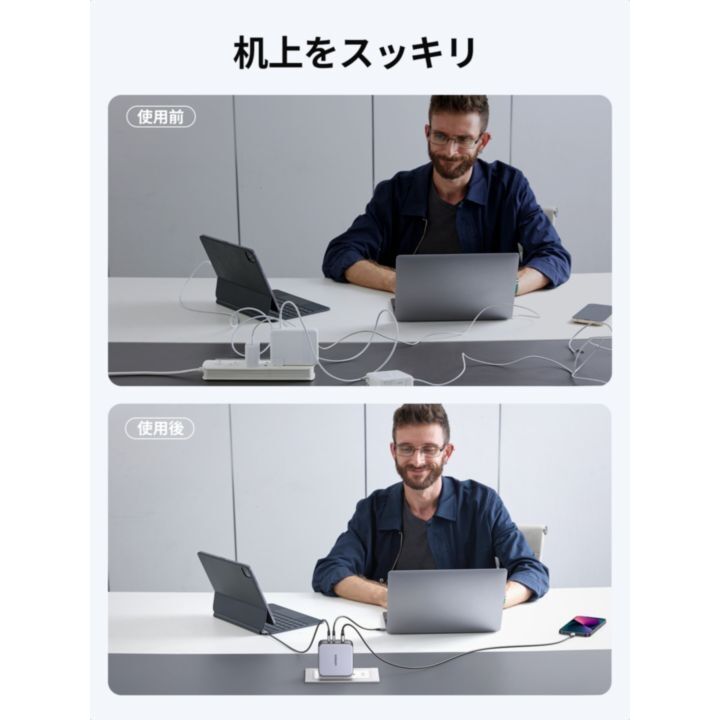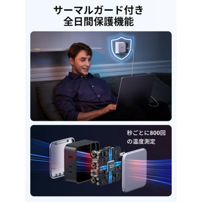 USB-C 2ポートとUSB-A 1ポートを搭載し、合計3ポートになり、ノートPCとスマホやタブレットなど、3台同時充電できます。