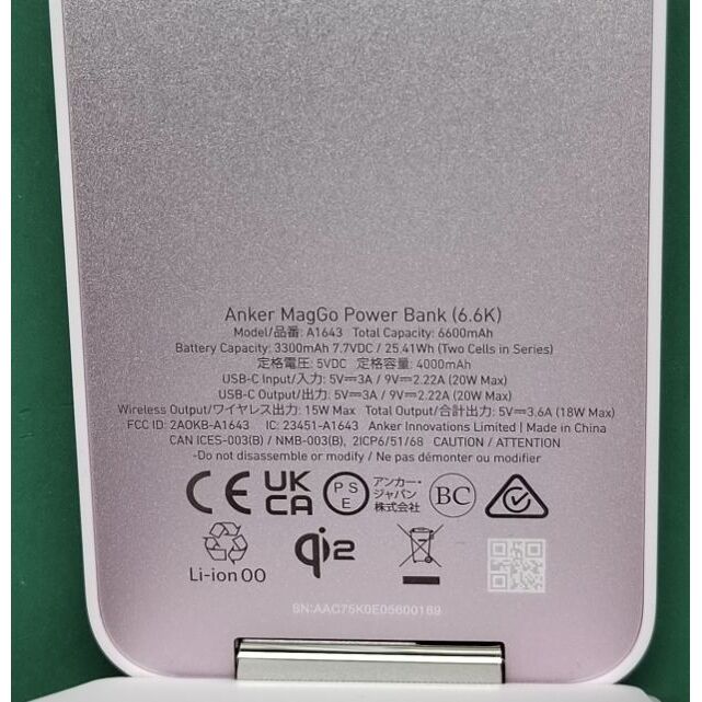 ・同梱物:Anker MagGo Power Bank (6600mAh) 、USB-C&USB-Cケーブル (0.6m)、取扱説明書
