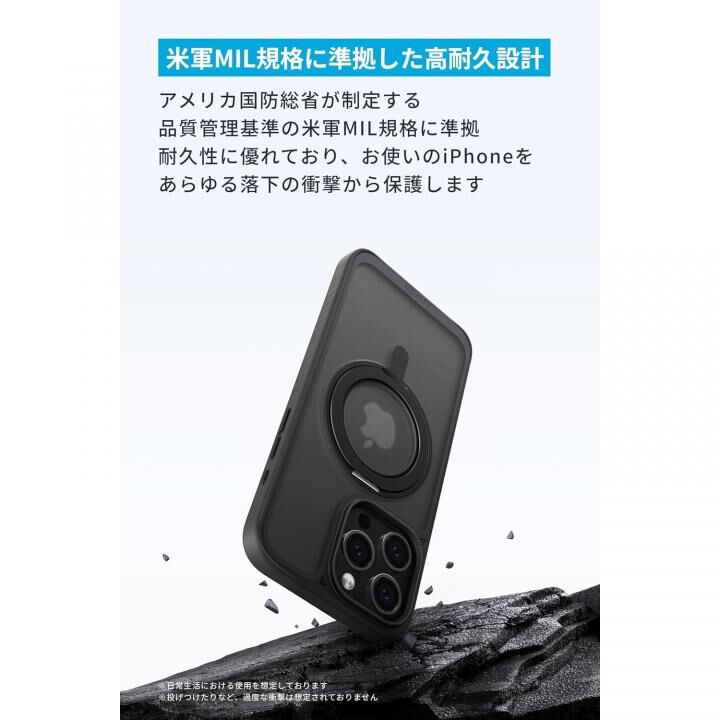 ・角度調整可能なリングスタンド iPhone 16 Pro専用スマホリング / スタンド一体型ケース、ケース背面のリングは360°回転するため縦横問わずお好みの角度でスマホ操作が可能です。 ・強力マグネットでピタッと装着 背面のリングにマグネット素材を採用し、カバーをつけたままでマグネット式ワイヤレス充電が可能です。 ・米軍MIL規格に準拠した高耐久設計 アメリカ国防総省が制定する品質管理基準の米軍MIL規格に準拠し、耐久性に優れており、お使いのiPhoneをあらゆる落下の衝撃から保護します。 ・汚れが目立ちにくいマット素材 背面には防汚性に優れたマット素材を採用し、指紋・汚れ、ほこりなどが目立ちにくくお使いのiPhoneをきれいな状態に保ちます。