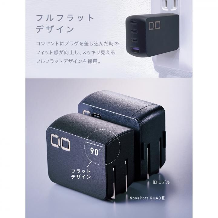 超コンパクトで高出力・多機能な4ポート充電器 NovaPort QUADⅡは高出力67Wを保ちつつ、4ポート搭載なので家族のデバイスや様々なガジェットも充電が可能になりました。 プラグ差し込み側をフルフラットデザインに変更 壁コンセントに挿した時の安定性が向上 電源プラグの根元に絶縁キャップを採用し、コンセントとプラグのすき間にほこりや水分が付くことで起こるトラッキング火災を予防
