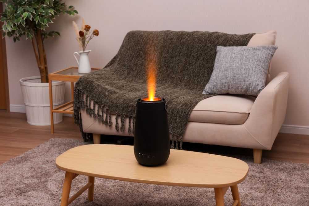ダブルファンで空間をパワフルに潤す加湿器。ミストが炎のように見えるLEDライト搭載で癒しの空間を演出。