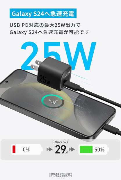 Galaxy S24へ急速充電:USB PD対応の最大25W出力で、最新のGalaxy S24シリーズへ急速充電が可能です。