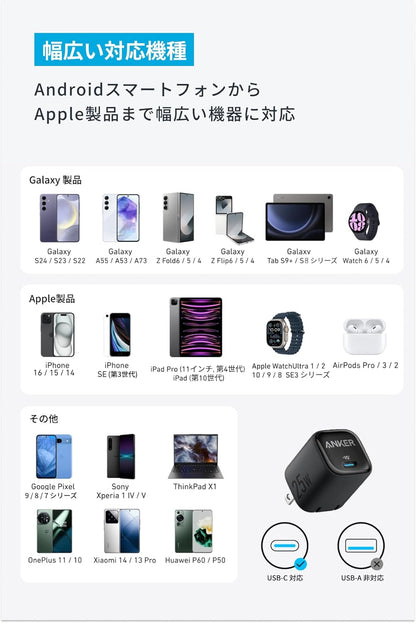 折りたたみ式プラグ搭載の超コンパクト設計:一般的な25W出力の充電器と比較して約30%小型化を実現。折りたたみ式プラグ搭載モデルで持ち運びにも最適です。